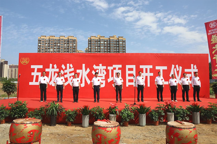 仪式现场,《五龙之歌》激昂回荡,印有“浅水湾 品质好”、“敢为人先 铸就一段建筑经典”、“建设美好生活 诠释幸福人居”等标语的彩旗迎风舞动,与仪式热烈氛围交相辉映,勾勒出美好未来图景。嘉宾们共同见证这一历史性时刻,纷纷合影留念,记录下这意义非凡的瞬间。